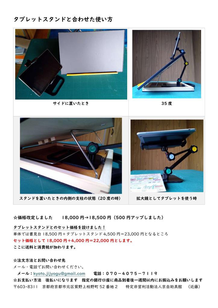 新モデル(四段階タイプ)のB級商品と旧モデルを特別価格でご提供いたします。どちらも17,500円(税抜き)です。タブレットスタンド(4,500円)とのセットの場合はさらにお得になります。通常22,000円になるところ21,000円(税抜き)です。送料と消費税が加算されます。数に限りがありますので、お早めにお問い合わせください。クレジット払いもできるようになりましたので、あわせてお問い合わせください。