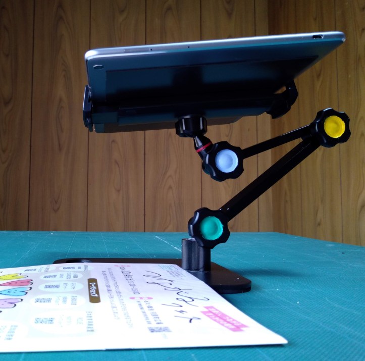 タブレットを拡大鏡として使う時のスタンドになります。見やすい角度に自由に変えられます。書見台用と拡大鏡用の2台使いが大変便利です。